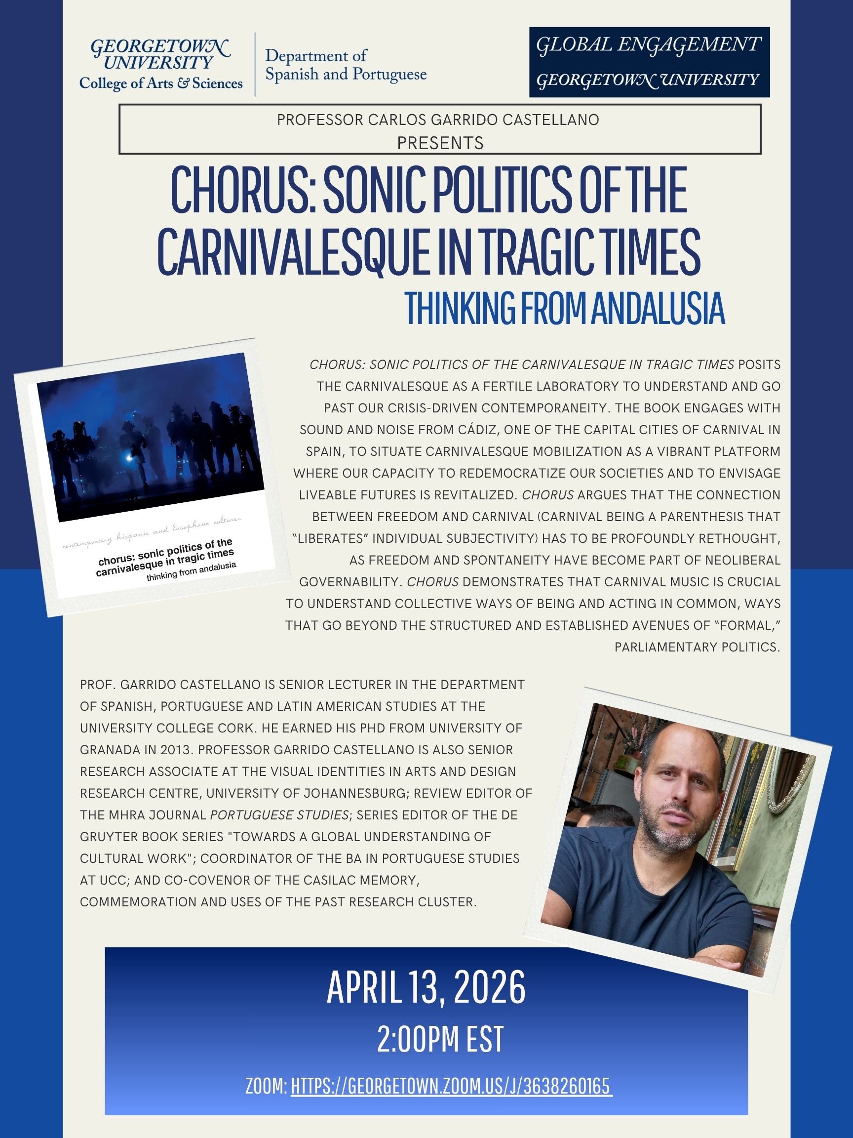 Join us for a book talk by Professor Carlos Garrido Castellano regarding his recent work, Chorus: Sonic Politics of the Carnivalesque in Tragic Times: Thinking from Andalusia. Professor Garrido…