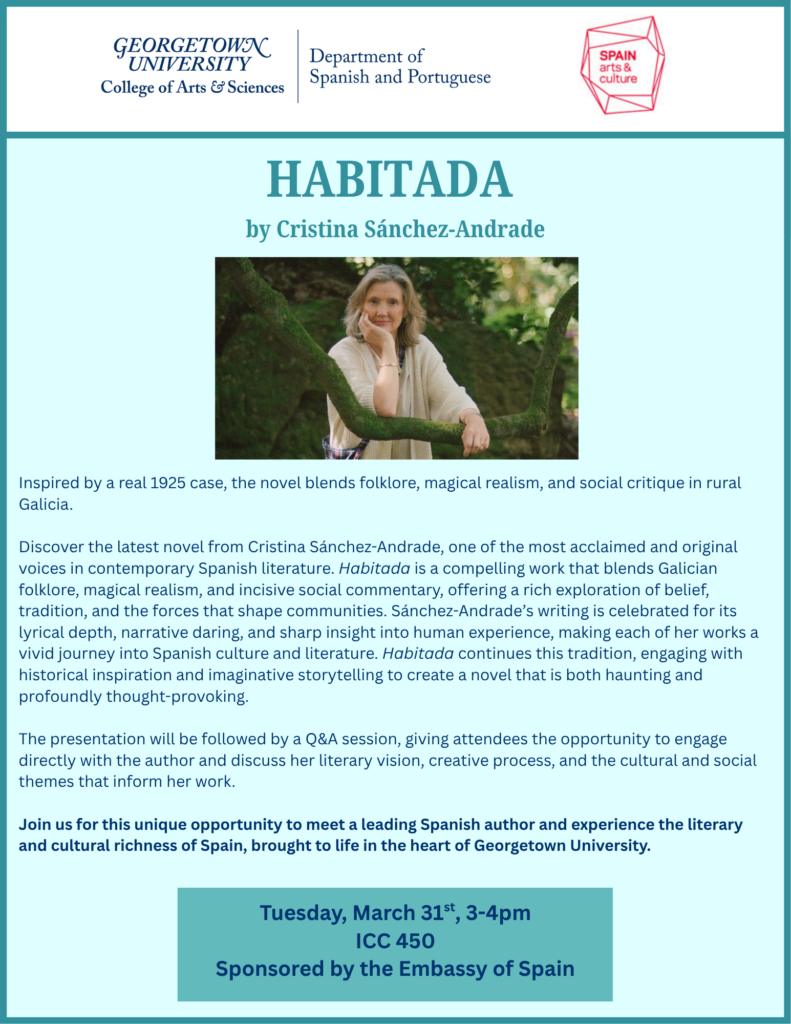 Please join us for a conversation with Cristina Sánchez-Andrade regarding her latest novel, Habitada. This compelling work blends Galician folklore, magical realism, and social commentary to explore tradition and community.​ The presentation will conclude with a Q&A session.